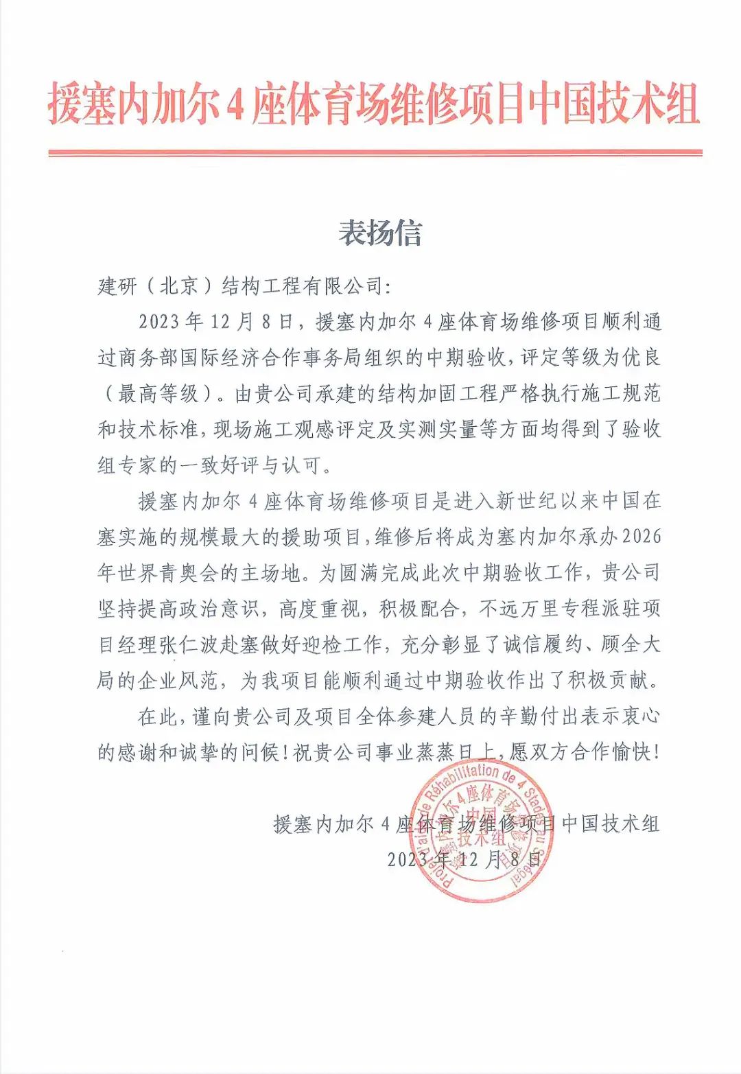 12月8日,援塞內(nèi)加爾4座體育場(chǎng)維修項(xiàng)目順利通過商務(wù)部國(guó)際經(jīng)濟(jì)合作事務(wù)局組織的中期驗(yàn)收,評(píng)定等級(jí)為優(yōu)良(最高等級(jí))。援塞內(nèi)加爾4座體育場(chǎng)維修項(xiàng)目中國(guó)技術(shù)組繼今年3月后再次向中建研科技所屬建研結(jié)構(gòu)公司發(fā)來表?yè)P(yáng)信,充分肯定和表?yè)P(yáng)了公司項(xiàng)目管理團(tuán)隊(duì)在該項(xiàng)目中作出的重要貢獻(xiàn)。
