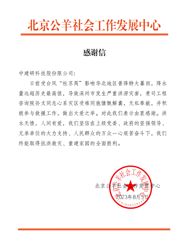 期間,中建研科技收到了“北京公羊社會(huì)工作發(fā)展中心”的感謝信,信中對(duì)孫文同志的無私奉獻(xiàn)和參與救援工作中做出的大愛之舉表示由衷感謝。