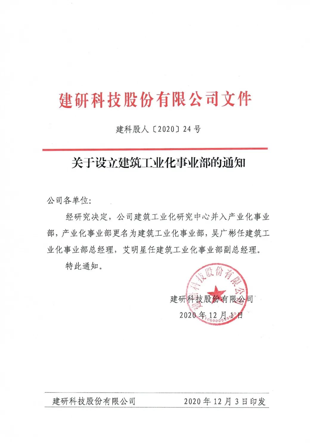 2020年12月31日,建研科技通過線下與線上結(jié)合的形式召開了建筑工業(yè)化事業(yè)部成立大會。