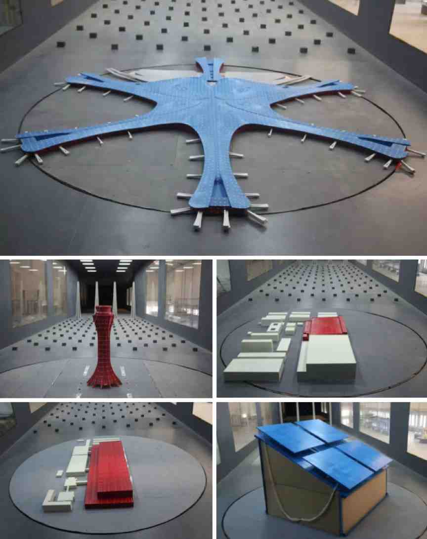 建研科技抗風研究中心先后完成了北京大興國際機場航站樓、東塔臺、東航機庫、南航機庫等項目風洞試驗和風振分析工作,為值機候機、空中交通指揮、飛機維護等各工種相關建筑結構的抗風設計提供荷載取值依據。