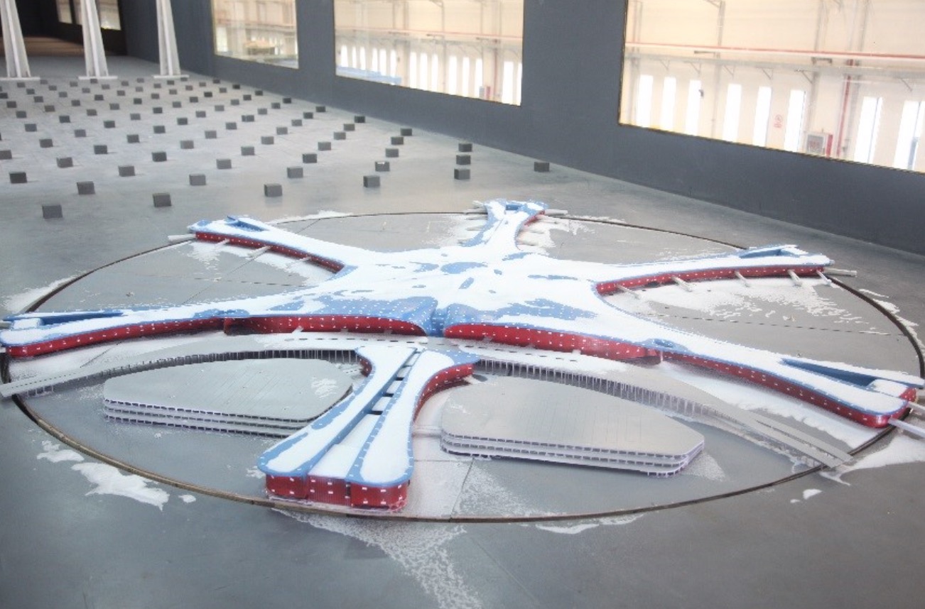 考慮到機場屋蓋跨度極大,積雪在風力作用下飄移可能形成不均勻堆積,對屋蓋安全帶來威脅。為此,建研科技抗風研究中心完成了航站樓的雪荷載模擬試驗,得出的屋面積雪分布系數為結構抗雪設計提供了基礎的計算資料
