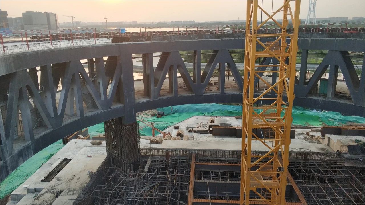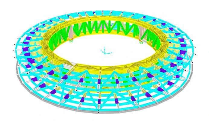 我們的工程師經(jīng)過多方案對比,最終選擇采用空間鋼結(jié)構(gòu)來實現(xiàn)觀景環(huán)廊。在內(nèi)環(huán)設(shè)置約1.5米寬、5.9米高的環(huán)形空間鋼桁架,鋼桁架下設(shè)三個支點,與下部混凝土結(jié)構(gòu)相連。支點處的桁架豎腹桿加粗,直接深入下部混凝土結(jié)構(gòu)當(dāng)中,既保證了支座的安全性,又將鋼結(jié)構(gòu)的支點巧妙的“藏”了起來,輕松實現(xiàn)漂浮感。環(huán)形空間鋼桁架分約36節(jié),根據(jù)建筑布置基本均分網(wǎng)格。桁架外側(cè)設(shè)輻射狀鋼梁懸挑近8.5米,輻射狀鋼梁間設(shè)次梁,鋪設(shè)鋼筋混凝土板。