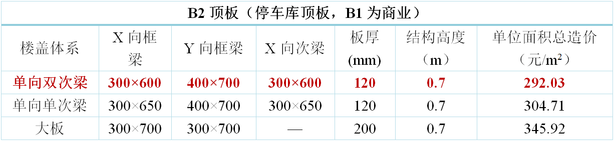 1)對于B1頂板(覆土區)在不限制梁高的情況下(梁高1.2m),單次梁方案造價最低。2)對于B2頂板(人防區),在不限制梁高的情況下(梁高1m),單次梁方案和大板方案造價基本相同,均為經濟較優方案。3)對于B1頂板(非覆土區)和B2頂板(非人防區),由于本項目嵌固端下移至B2頂板,B1頂板和B2頂板均應滿足嵌固端樓板板厚和配筋要求,但單向雙次梁方案次梁較多,可適當減小板厚至160mm,在此情況下采用單向雙次梁方案最經濟。三.海南綜合體項目