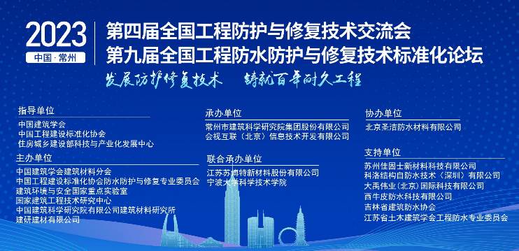 2023年5月18日-5月20日,由中國建筑學會、中國工程建設標準化協會、住房城鄉建設部科技與產業化發展中心指導,中國建筑學會建筑材料分會、中國工程建設標準化協會防水防護與修復專業委員會、建筑環境與安全國家重點實驗室、國家建筑工程技術中心和建研建材有限公司共同主辦的“第四屆全國工程防護與修復技術交流會”(以下簡稱“技術交流會”)“第九屆全國工程防水防護與修復技術標準化論壇”(以下簡稱“標準化論壇”)在江蘇常州圓滿舉辦。會議主題為:“發展工程防護與修復技術,鑄就百年耐久工程”