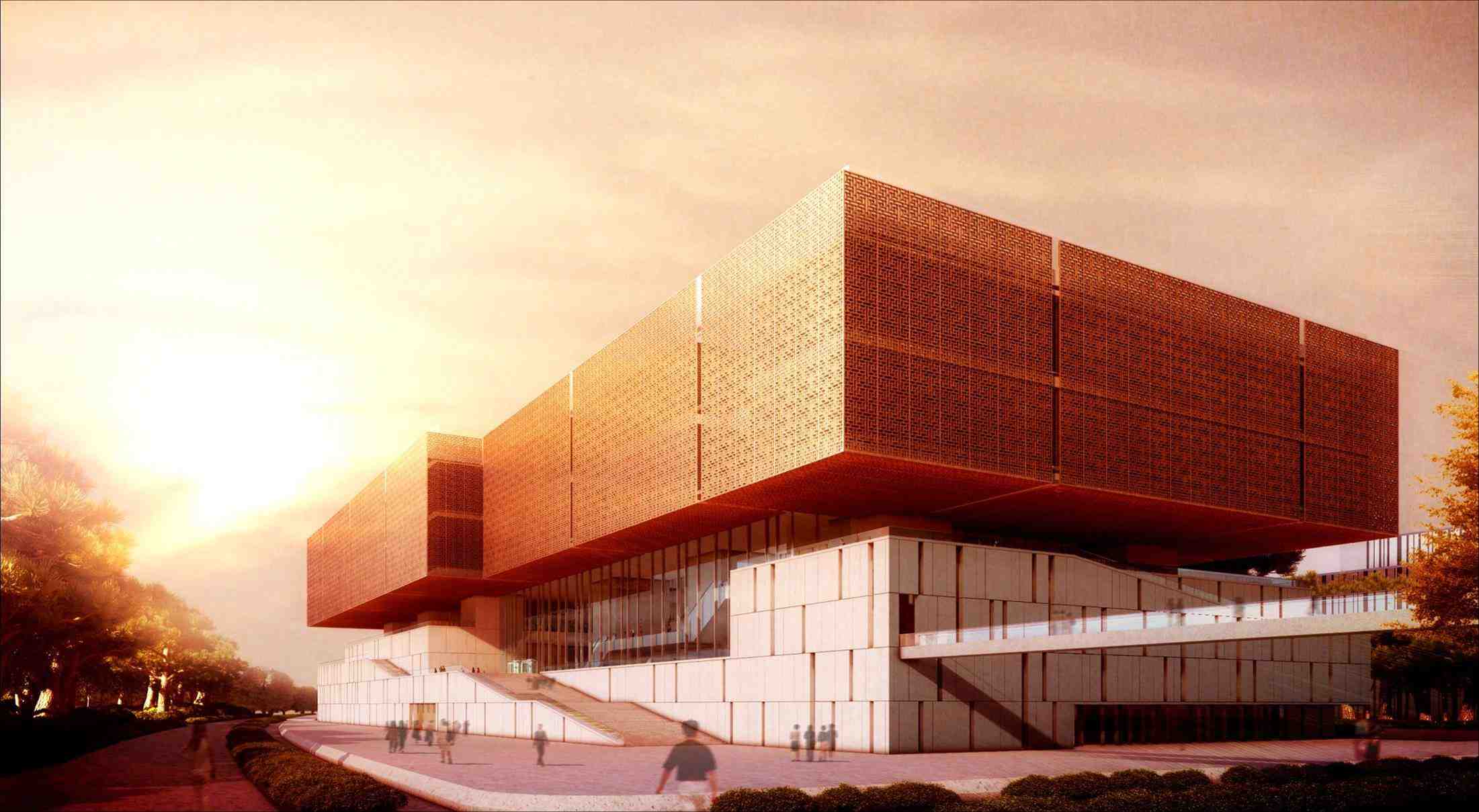建筑下部為堅實穩(wěn)重的實心體基座,上部造型為“凌空的藏寶閣”,外覆中國傳統(tǒng)圖案的格柵。位于“藏寶閣”內(nèi)的“百寶箱”的設計構(gòu)思與靜態(tài)、動態(tài)展示區(qū)所展示的中國傳統(tǒng)工藝美術珍品相呼應,寓意形象而鮮明。展廳的空間面積也各不相同,可以滿足不同藝術作品的布展需要。