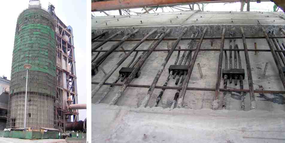 筒倉高58m,外徑23m,壁厚380mm,采用環向配置預應力筋,環、豎向配置單層鋼筋網的混凝土疊合層法進行加固。