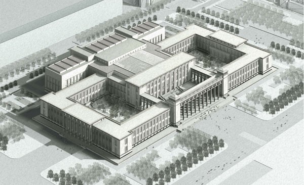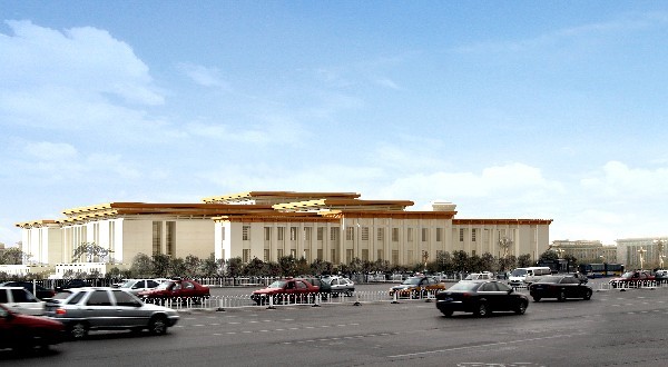 改擴建工程預應力設計。展廳采用井字梁樓蓋,最大柱網18m×18m;報告廳采用單向梁-板結構,跨度29m。