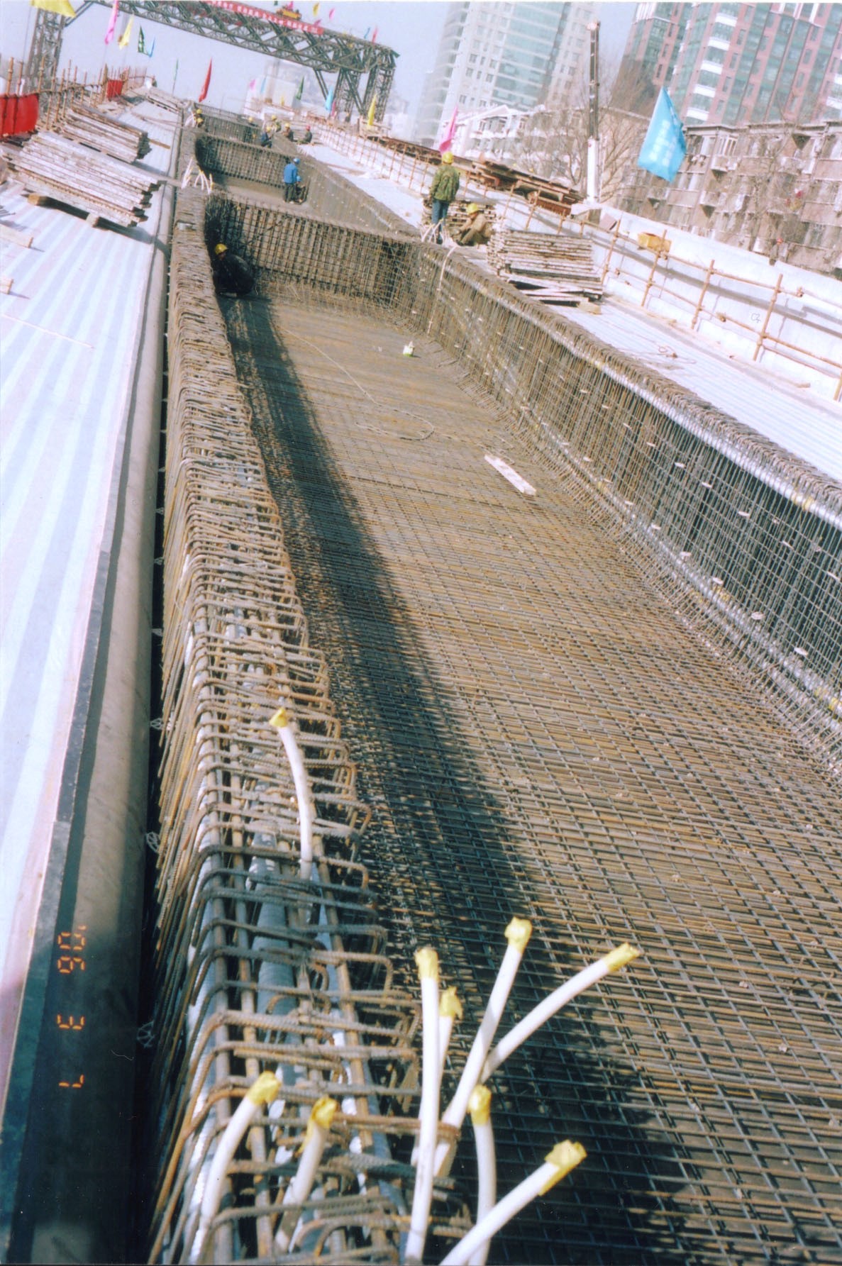 預應力施工。預應力T型簡支梁,跨度60m,國內(nèi)第一例雙幅面轉體施工的橋梁。